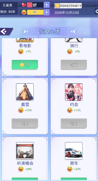 花费金币进行 看电影 , 约会 ,骑行,录影,吃零食等可以轻松恢复心情值