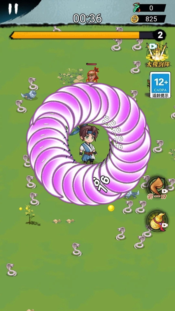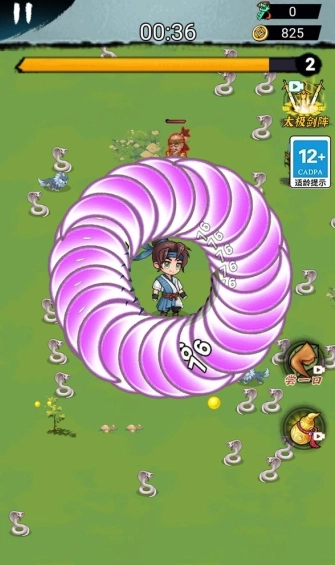 在游戏中玩家将成为鸠摩智, 控制 身边不断转动的大刀来消灭 怪物 ,获得掉落的经验球提升自己的等级,解锁更多难度阶段。