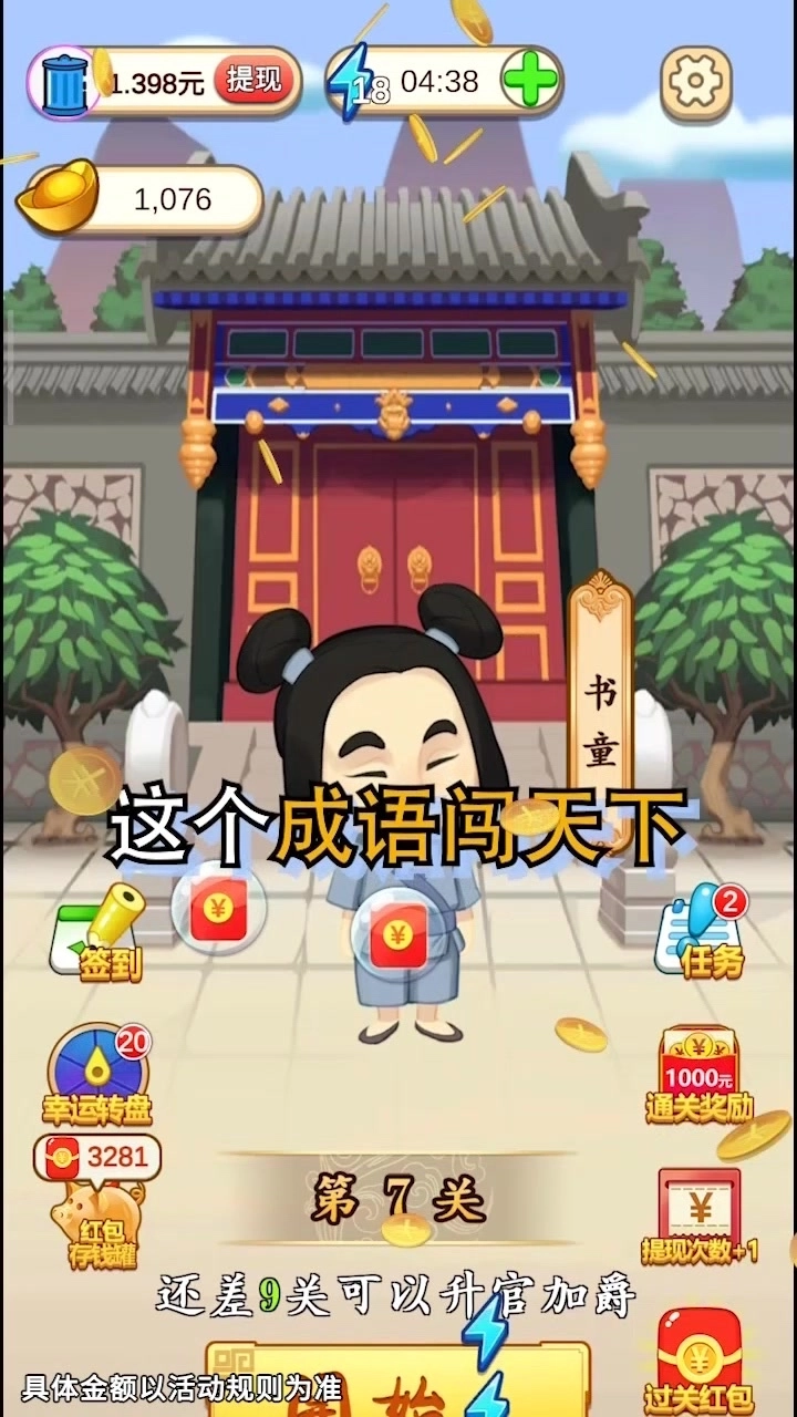 成语闯天下100元能提现吗?不少朋友都在询问这个问题,今天本人亲自体验了一番,以查看实际效果。这款游戏的操作其实相当 简单 ,而且各种福利丰富,只要绑定 微信 就能进行提现,几分钟内成功提现了几毛钱。但若想提现100元,则需要完成大量 任务 ,相对较为耗时!感兴趣的玩家请前往 007游戏 网 下载 成语闯天下!
