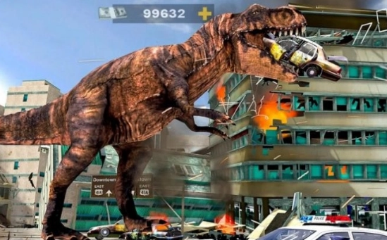 滑动屏幕控制恐龙,让恐龙在城市中“横冲直撞”。