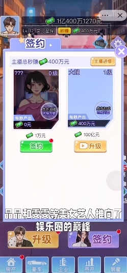 【签约各类明星】:玩家可通过不断提升公司的等级,获取更高的知名度和更多的资源,最终实现签约各类明星,华丽逆袭。