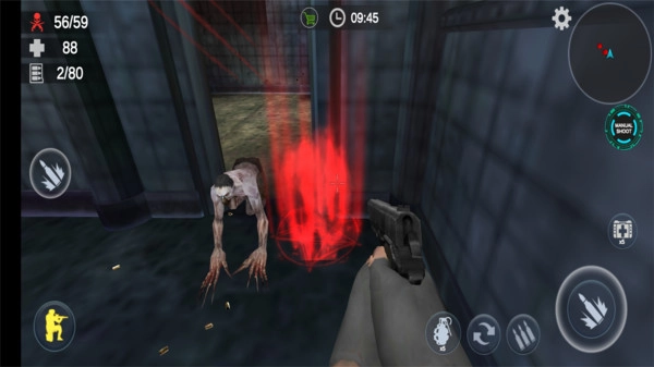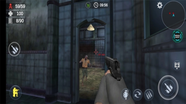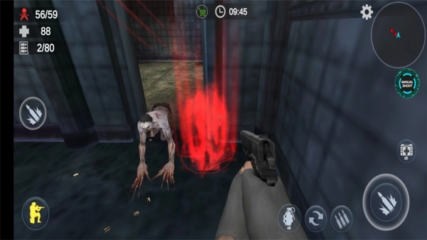 右下角有三个按钮,上面那个是装子弹,中间那个是射击,下面那个是近距离调试(这样射击就比较精准),当瞄准器变成红色就说明对准僵尸了,赶紧射击吧,左上角的地图也是要看的,有红色点点出现就说明僵尸出现咯。