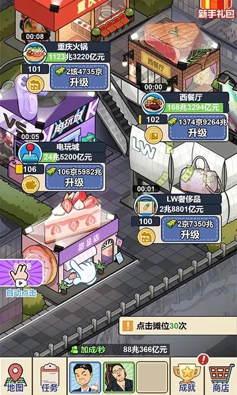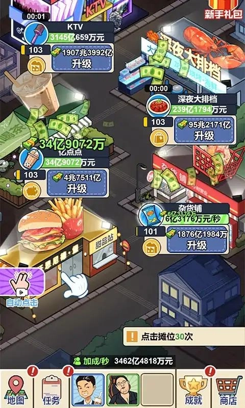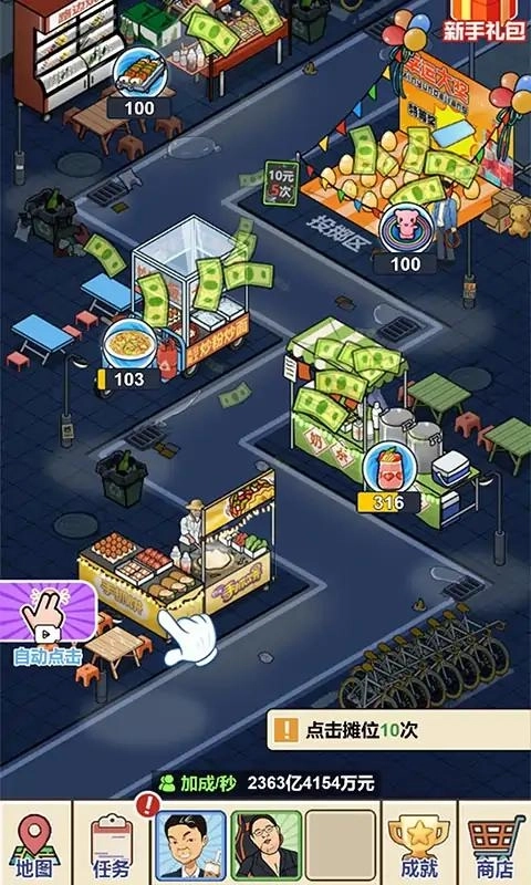 不断点击商店快速赚取财富和金钱,从而成为夜市中的商业投资鬼才!