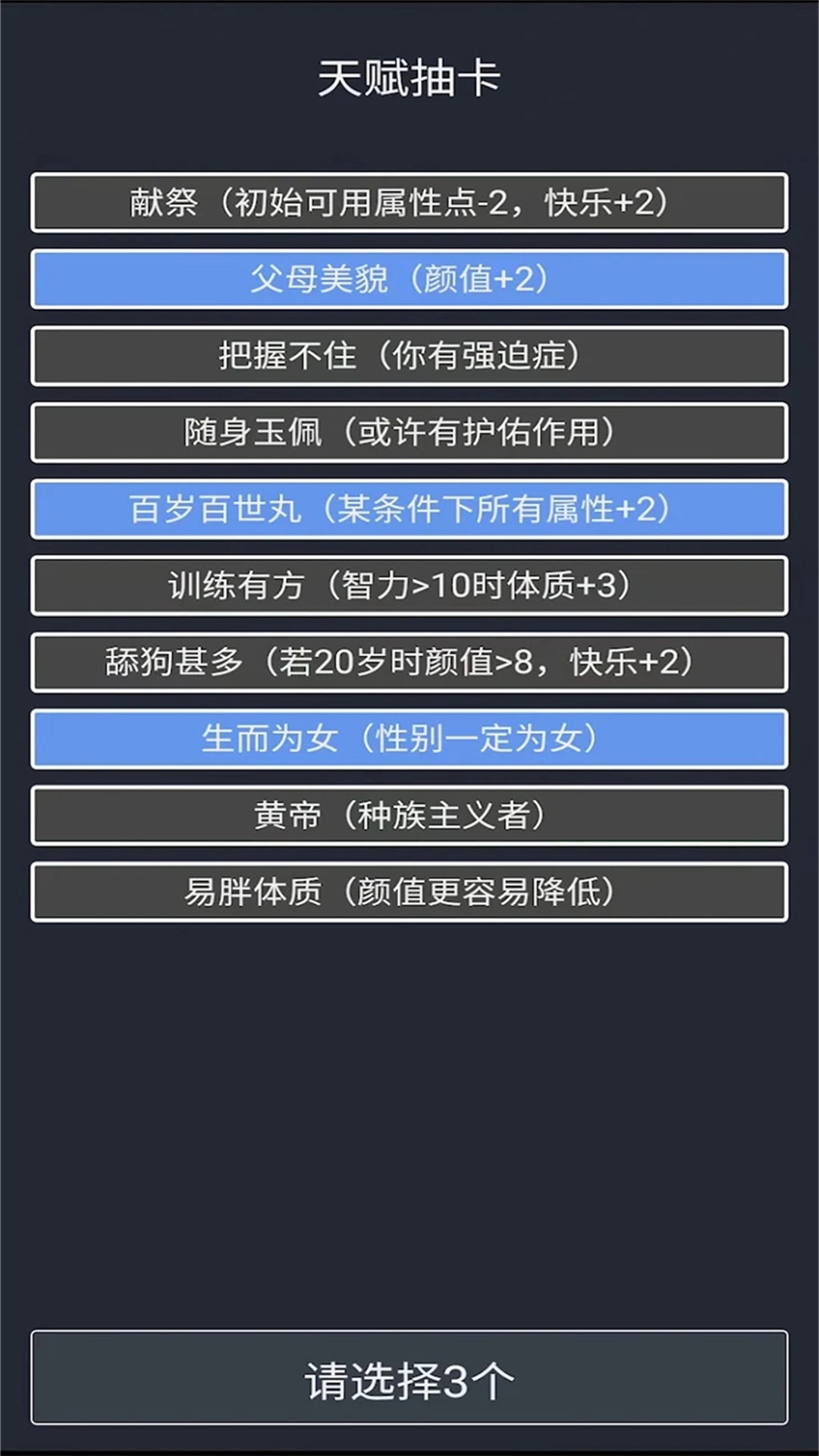 点击立即重开后,点击十连抽,会出现十个天赋,任选三个。