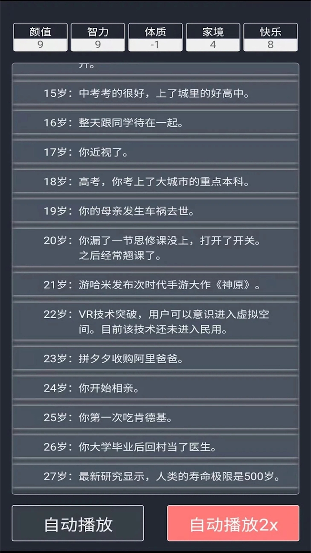 重启人生 模拟器 ,支持无数次重来的生涯 模拟游戏 。主要采用文字模拟方式,玩家通过选择和提升属性,进行剧情决策来体验全新的生活,可以无数次重新开始,直到你感到满意为止。
