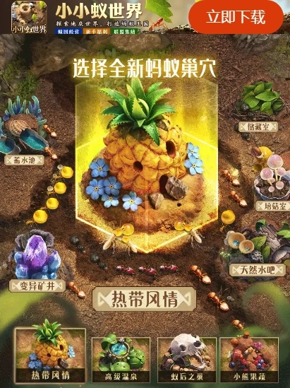 小小蚁世界游戏是一款充满乐趣和挑战的蚂蚁策略游戏。游戏中拥有经典的蚂蚁地图,玩家可以自由体验极其精彩的游戏玩法。无论是哪种玩法,都可以自由尝试,从而获得非凡的游戏体验。通过不断建造和扩展巢穴,壮大自己的蚂蚁族群。游戏中丰富的趣味玩法让玩家能够尽情探索,享受愉快的游戏过程,亲手建立自己的蚂蚁帝国。