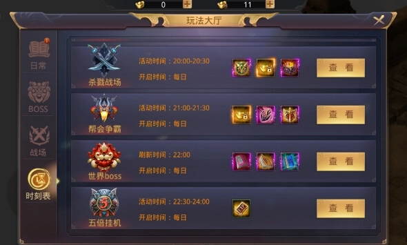 玩家点击“玩法”进入玩法大厅可根据时刻表选择不同玩法,其中护送美人和五倍 挂机 玩法产出大量经验奖励,想要快速升级的少侠们不容错过。