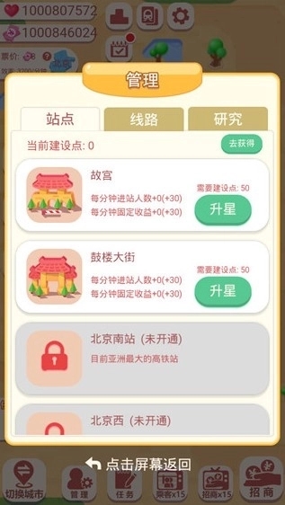 首先是一个起点站,你需要经过很多站点,积累财富,开辟多条地铁线路。