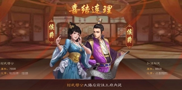 子嗣成年后转移至龙凤殿等待结亲,在明朝风云手游中,玩家可通过提亲、招亲等方式让子嗣与其他玩家的子嗣联姻,获得对方子嗣的属性加成。联姻对象必须是其他玩家相同爵位的异性子嗣。联姻需要消耗聘礼道具,不同爵位的聘礼道具不同。联姻成功后,子嗣将会从龙凤殿转移至王府内苑。