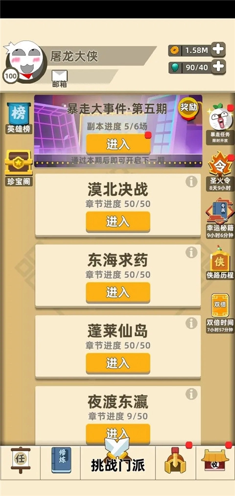 2、打过了大侠关卡后建议挂大侠关卡,不一定要通关,打过第一关就行,剩下的交给跳关。