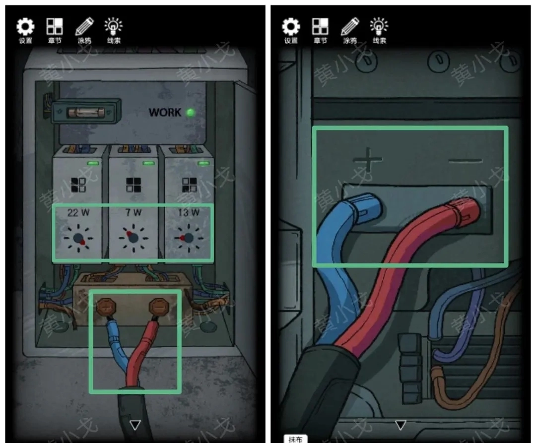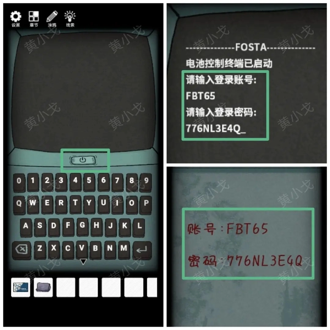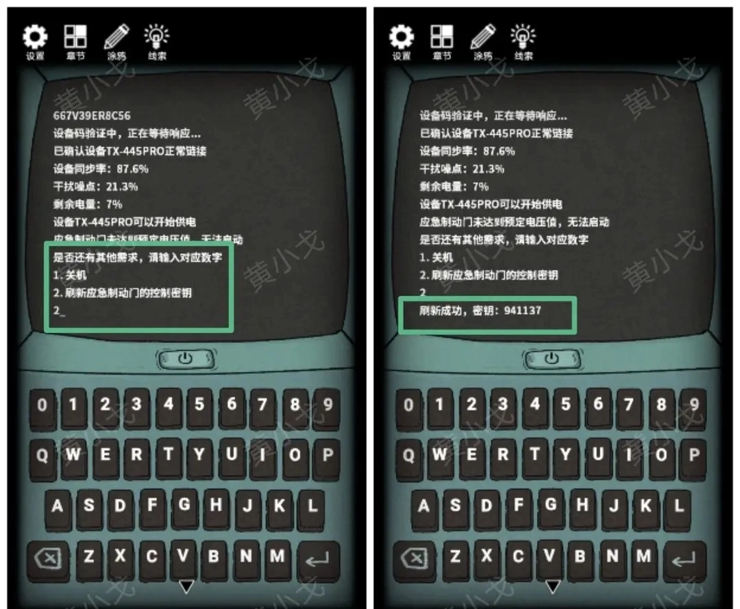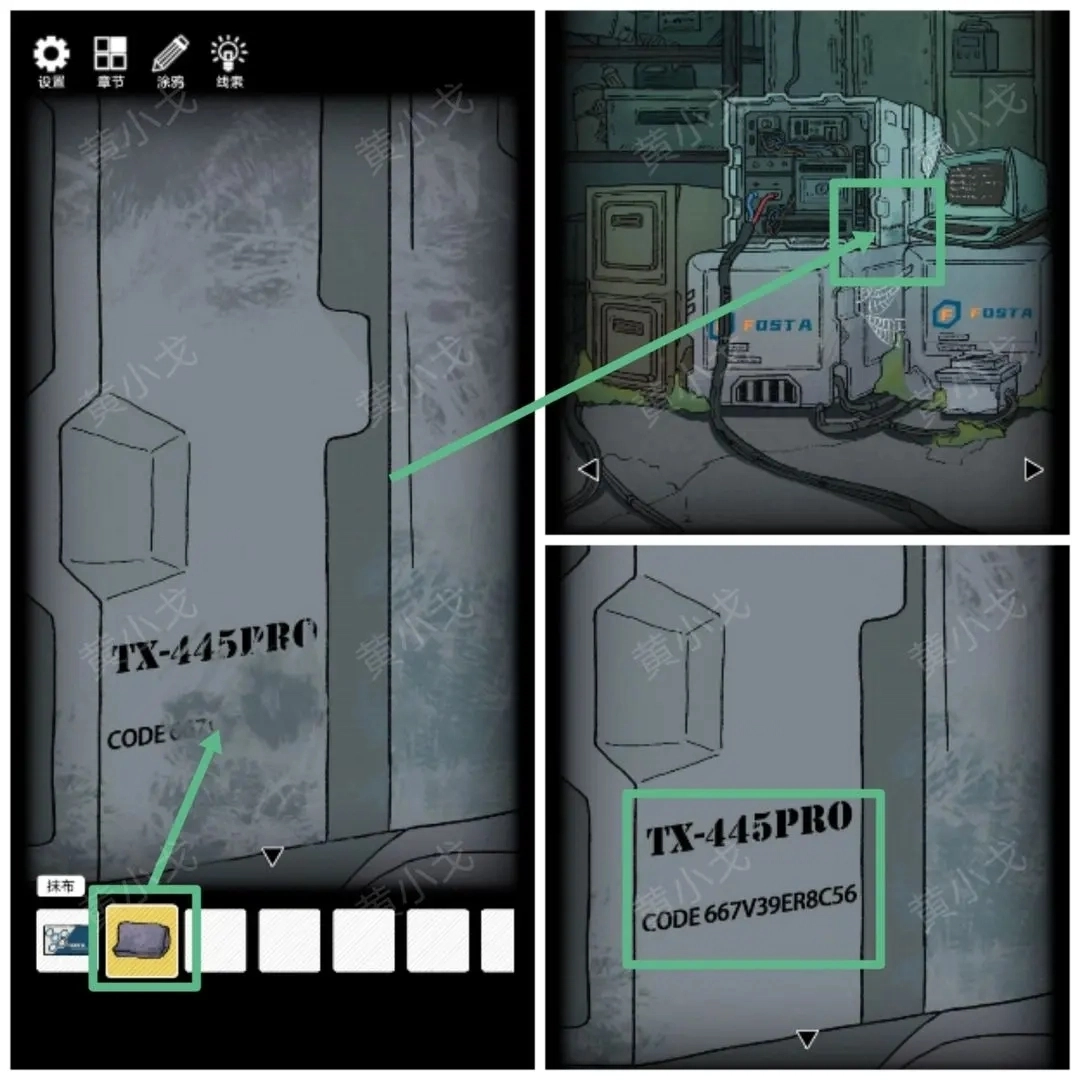 12.(终端机)点击电池右边的污渍,用【抹布】擦掉,获得设备码(667V39ER8C56)