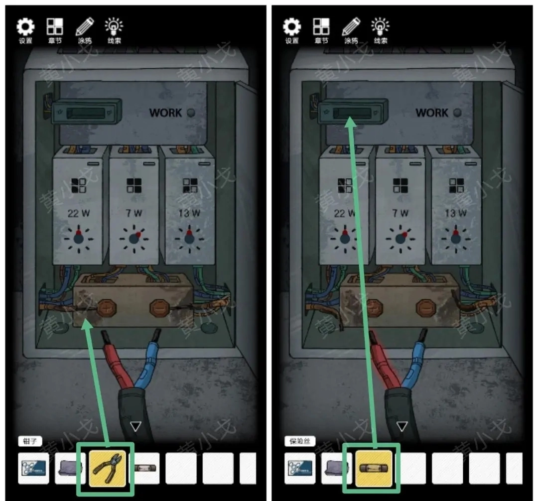 19.点击电箱,用【钳子】拆掉旧的电线,装入【保险丝】
