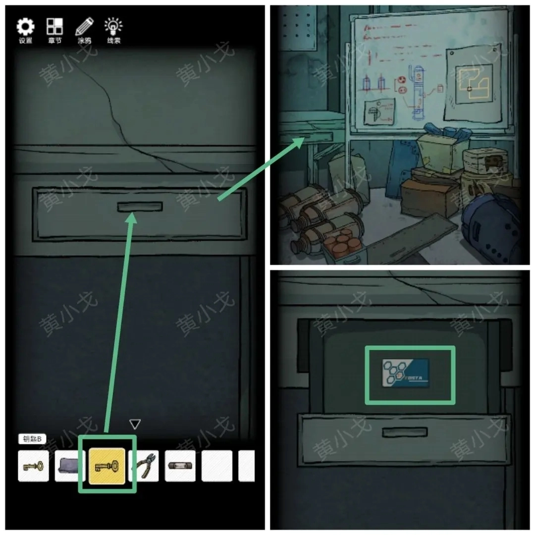 9.点击桌子的抽屉,用【钥匙B】打开,获得【门禁卡】