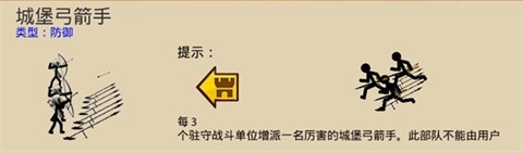 城堡射手:玩家点击防御城堡后生效。这个单位不受玩家控制。