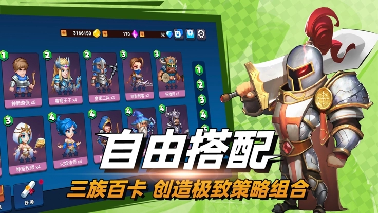2.包含英雄,建筑,以及法术的搭配,尝试三组不同的战术策略,走位并释放卡牌,扭转整个战局。