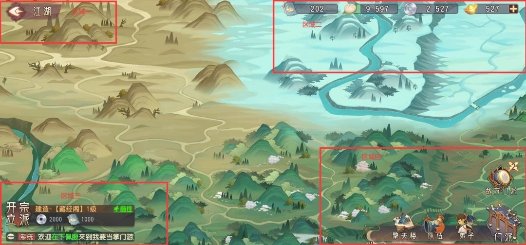 一、门派地图界面可以分为四个区域: