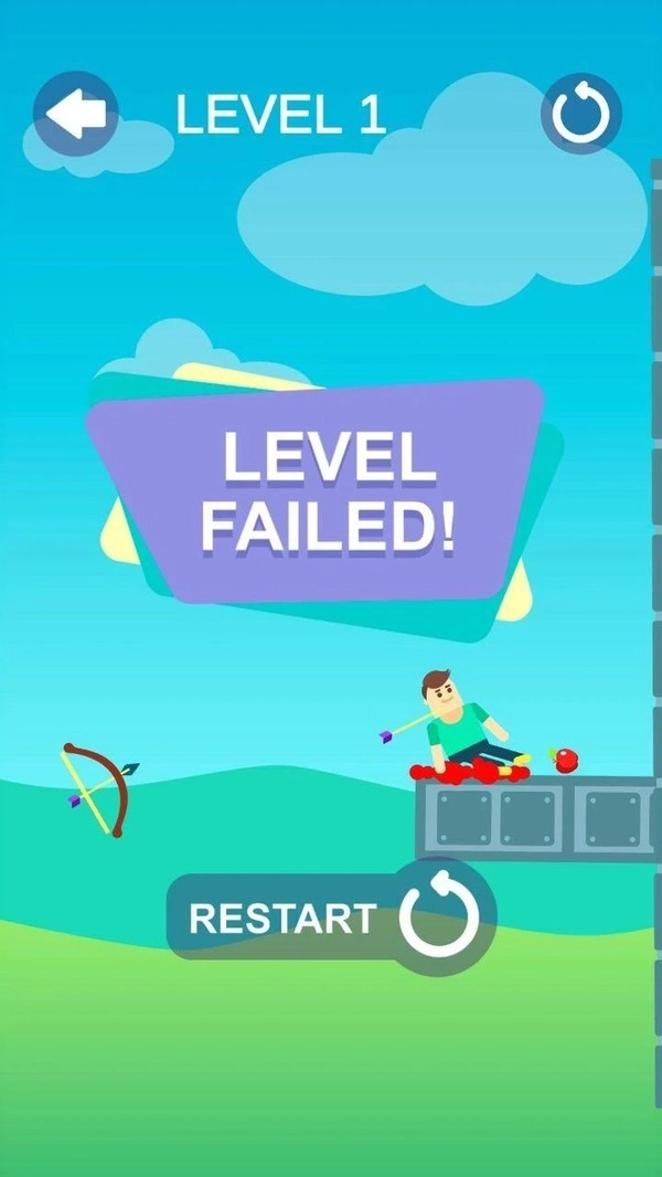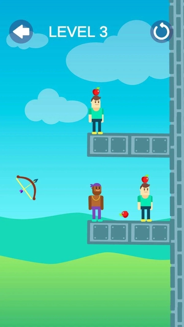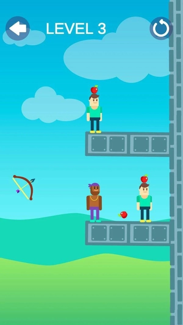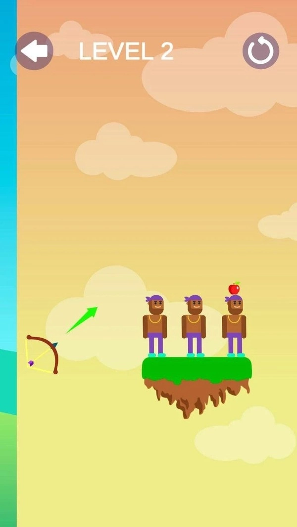 1,游戏中的画面非常的清新,玩家需要在关卡中通过弓箭射击人物头顶的苹果,你必须拥有非常好的准度,才能完成任务。