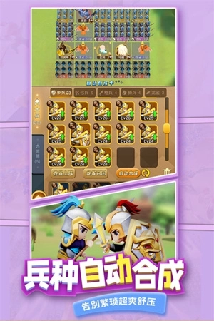 迷你军团拥有无限钻石和无限金币的小内存版本,同时具备有趣的兵种合成玩法。玩家可以在游戏中自动合成各类兵种,如步兵、弓兵、枪兵、骑兵、龙雀等,享受最有趣的军团兵种培养体验。