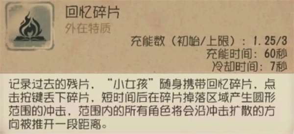使用【回忆碎片】时会将监管者推开,如果技能生效前被监管者普通攻击命中便会取消监管者的攻击后摇,在使用时需确认自身与监管者身距以及对方否有攻击操作,避免使用时机不当而取消”擦刀”。