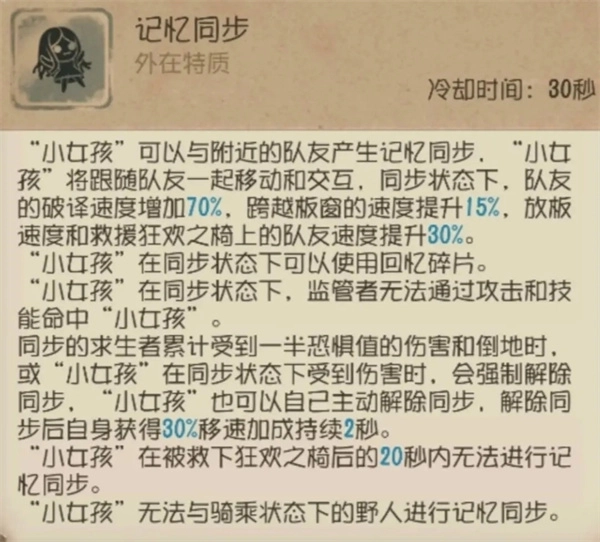 ① “小女孩”在求生者中是一个灵活多变的角色,可以通过求生者的阵容来选择天赋。“小女孩”的优势在于有着不俗的牵制能力同时还具备全图支援的特点,当监管者追击“小女孩”时可以先自己牵制,等受到一次普通攻击后再选择寻找牵制能力较强的队友使用【记忆同步】让队友接力牵制,将牵制时间最大利益化。在场上队友需要治疗时可以选择使用【怜悯】快速传送到队友身边治疗;需要补密码机时可以使用【怜悯】快速前往正在破译的队友附近,节省赶路时间;“小女孩”自身技能【回忆碎片】配合【记忆同步】可以辅助队友牵制,延长牵制时间,在牵制过程中也可以解除【记忆同步】帮助队友抵挡伤害或者放下板子。