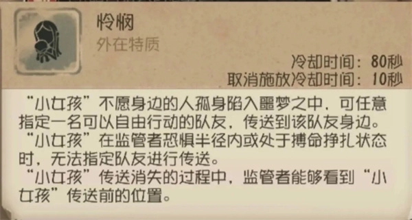 ② “小女孩”开局只有一个【回忆碎片】,自身牵制能力较弱,如果出生点离监管者距离较近,且处于不利于牵制的位置,可以使用【怜悯】传送至位置相对安全的队友附近再进行拉点。