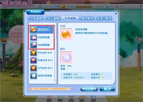 (2)经验泡泡糖、经验棉花糖(可通过炫宝儿技能进行制作)