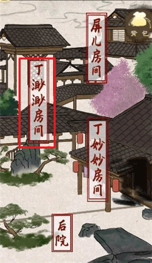 6、接下来探索屏儿房间,接着询问屏儿在这里会多出两个问题,进行询问可以得到几个线索屏儿的不在场证明还有火灾时,梅花坊只有丁妙妙在,林三娘在丁妙妙死前一天意外身故。还能解锁后院场景。
