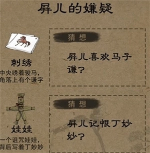 8、在诅咒娃娃的肚子当中可以得到一块布料,接着和屏儿进行对话选择和丁妙妙的关系,出示诅咒娃娃,第二段对话之后出示屏儿的刺绣手帕上绣着谦字这个线索。