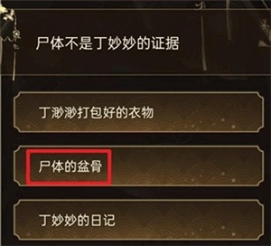 21、之后对话选择丁渺渺是凶手,尸体不是丁渺渺的证据是选择尸体的盆骨,选项选择尸体不是丁妙妙,第二个问题大难是丁妙妙打包好的衣物。