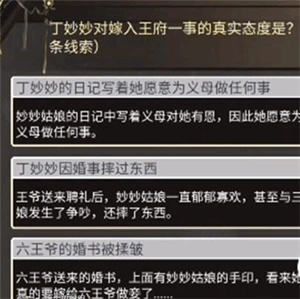 10、对话之后可以得到丁妙妙后腰上的胎记线索,之后点击丁渺渺的房间。在房间当中进行对话,在这里进行三种对话,对话完成之后可以得到丁渺渺猜测马子谦产生臆想。