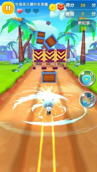 既然以喜羊羊为主题,那么画面自然而然的肯定是走着跟动画片一样的萌系卡通路线,充满童趣的画面中,Q版的房子、障碍物、道路五彩缤纷,仿佛将大家带入了一个童话世界,并且植入原班人马喜羊羊和它的小伙伴们,当然还有那可恶的灰太狼,主角跑跳逼真的动态特效,代入感十足。