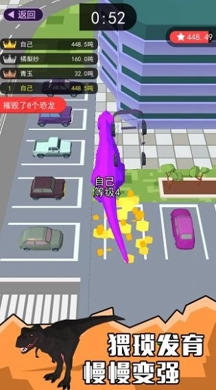 2、采用简洁的卡通画风,在游戏世界中模拟真实恐龙展开一场场刺激的乱斗。