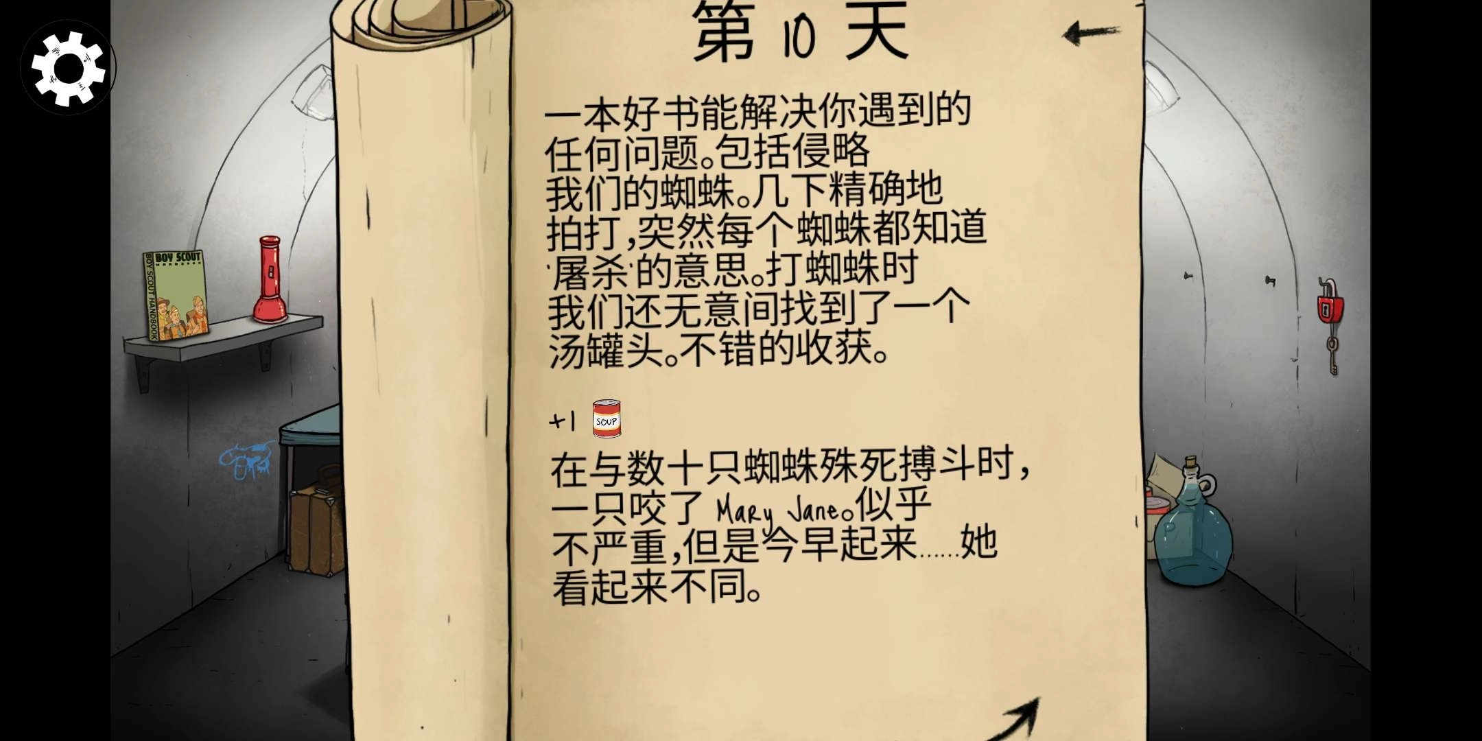 2. 触发蜘蛛剧情,玩家需在避难所获得空水瓶,前期喝两次水即可达成条件。剧情触发时,若选择用书本击打蜘蛛,第二天女儿就会发生变异。