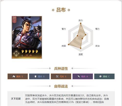 有着全游戏最高武力成长,统帅属性优秀,速度快,是物理阵容的最佳选择