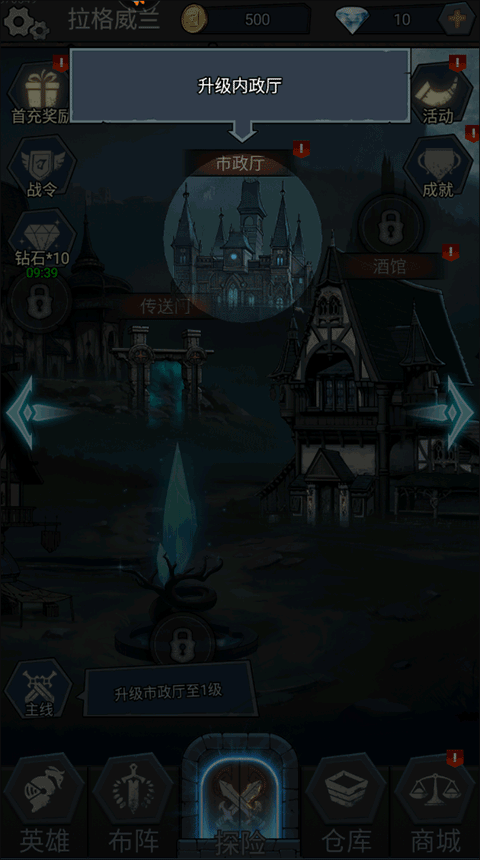 2、首先进入酒馆,在酒馆中找到并点击“升级”按钮选项;