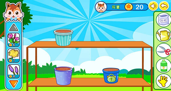 2、宝宝可在左边挑选心仪的花朵,种入盆中,右边摆放着化肥、花洒、剪刀等物品。