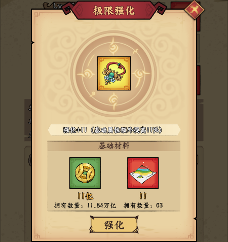 极限强化:属性精炼满将会开启,极限强化所消耗五行精华和金币会随着强化等级递增。