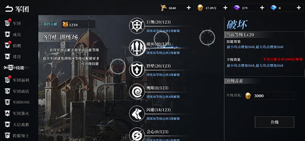 3、军团技能:军团训练场建成后,各位天启们可消耗金币与贡献值学习军团技能。需留意,军团内总计10个技能,每个技能给予角色的属性加成各不相同。军团技能的解锁数量以及技能等级上限,均与训练场等级相关。玩家若想提高技能等级上限,训练场等级便尤为关键。