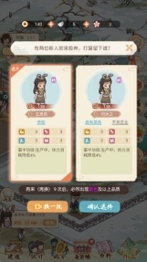 8、进入伙计界面,该界面分为已加入和待加入两个类别。点击员工后,能够查看当前员工的等级、心情、体力、经验、体能、武力、敏捷、技艺以及其工作状态。此外,不仅可以勾选员工的工作内容,还能够对员工进行遣送或者赠礼操作。