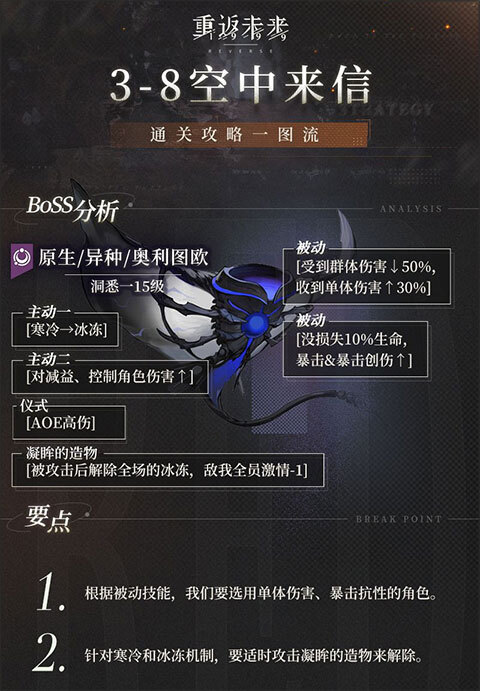 玩家角色受到这个boss的普通攻击时,会产生冰冻效果,而boss的大招更是能造成高额伤害。此外,boss有个极具特点的被动:血量越低,暴击率越高。因此,玩家需要选用一些具备暴击抗性的角色,同时在战斗过程中,要维持自身角色的血量。