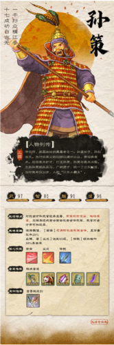 武将传记:吴国政权的奠基者,一统江东,武勇犹如霸王项羽,故有绰号“小霸王”。
