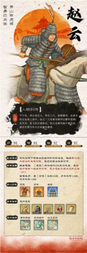 武将传记:身长八尺,姿颜雄伟,追随刘备征战近三十年,战果颇丰,被赞为有大臣局量的儒将。