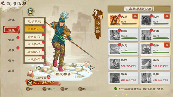 武将技能依靠技能碎片进行升级,技能碎片的核心获取途径为在观星阁中通过【问道】分解其他武将碎片。除问道外,奇门遣将、异邦来访、武将切磋等也是获取技能碎片的渠道。