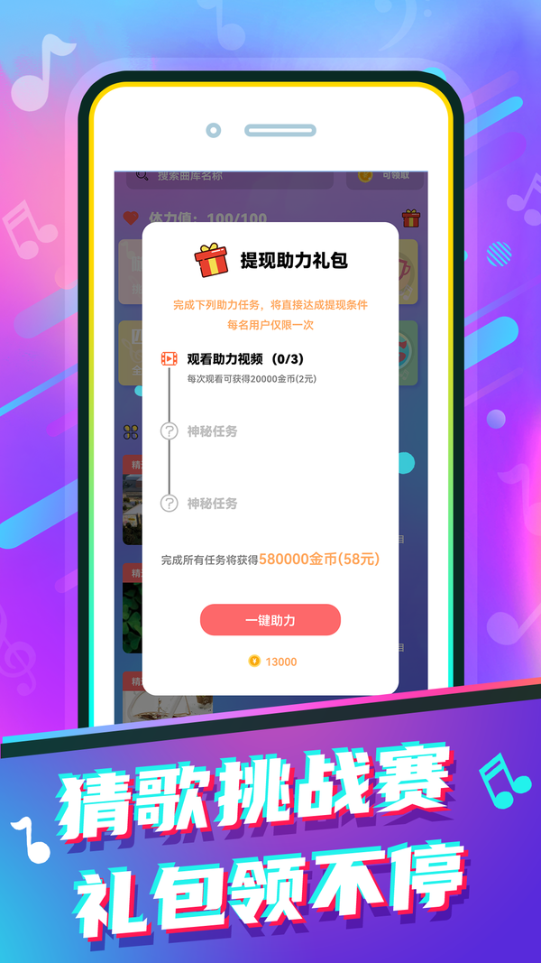 1、玩猜猜歌就能轻松赚钱,提现瞬间到账。 2、超有趣的猜歌软件,不仅好玩还能赚零花钱,操作超简单!