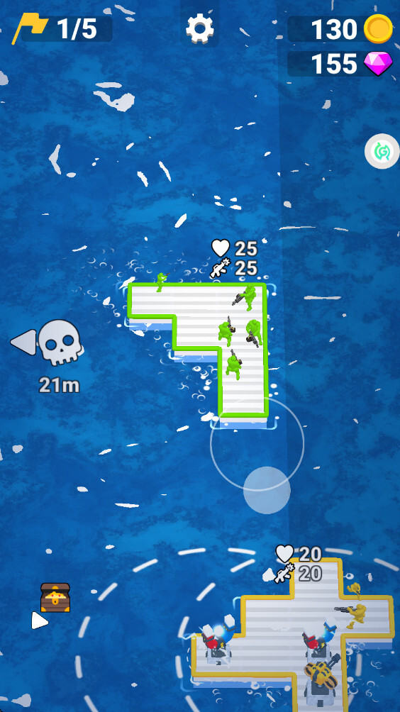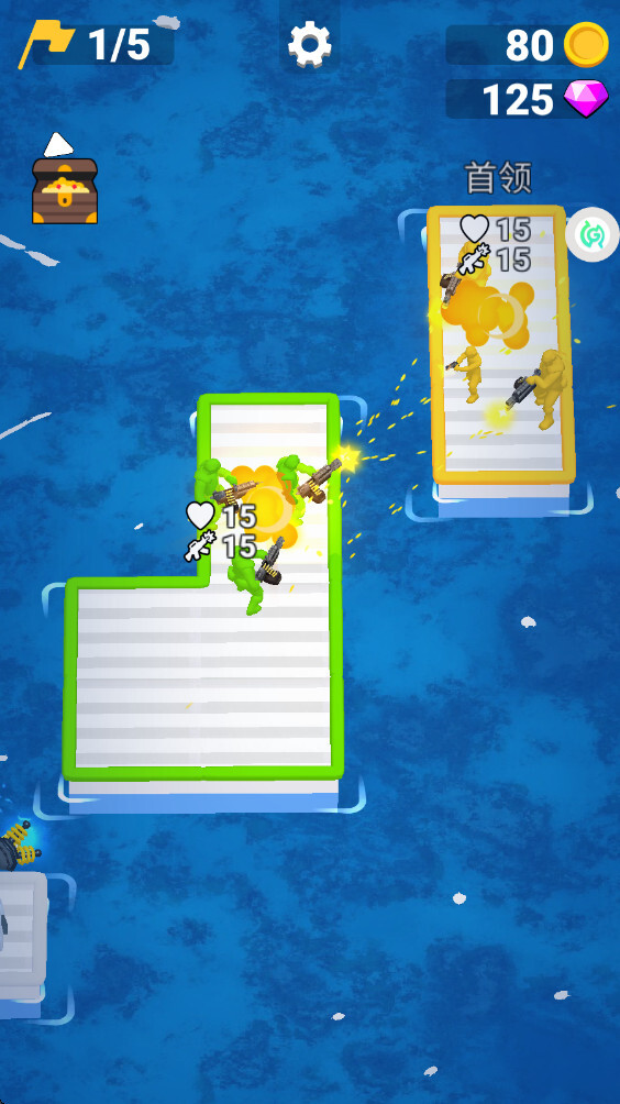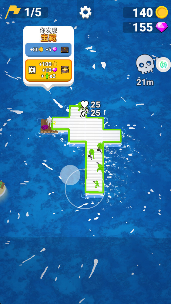 2. 操控木筏在大海中行进,收集海面漂浮的金币与钻石,借此来建造射击塔,对敌方敌人展开攻击。