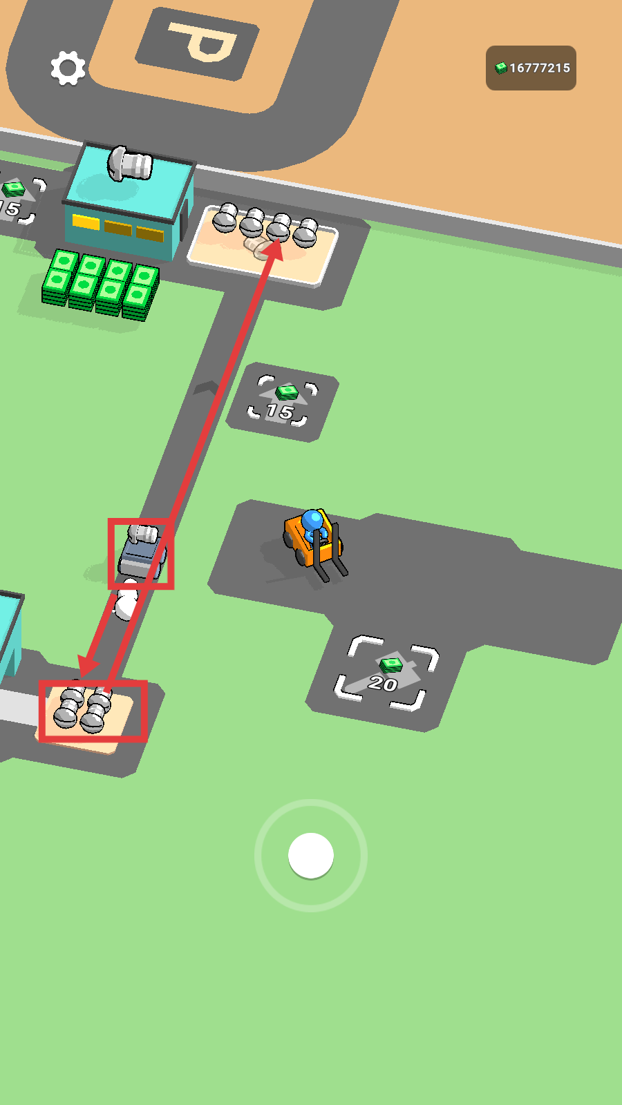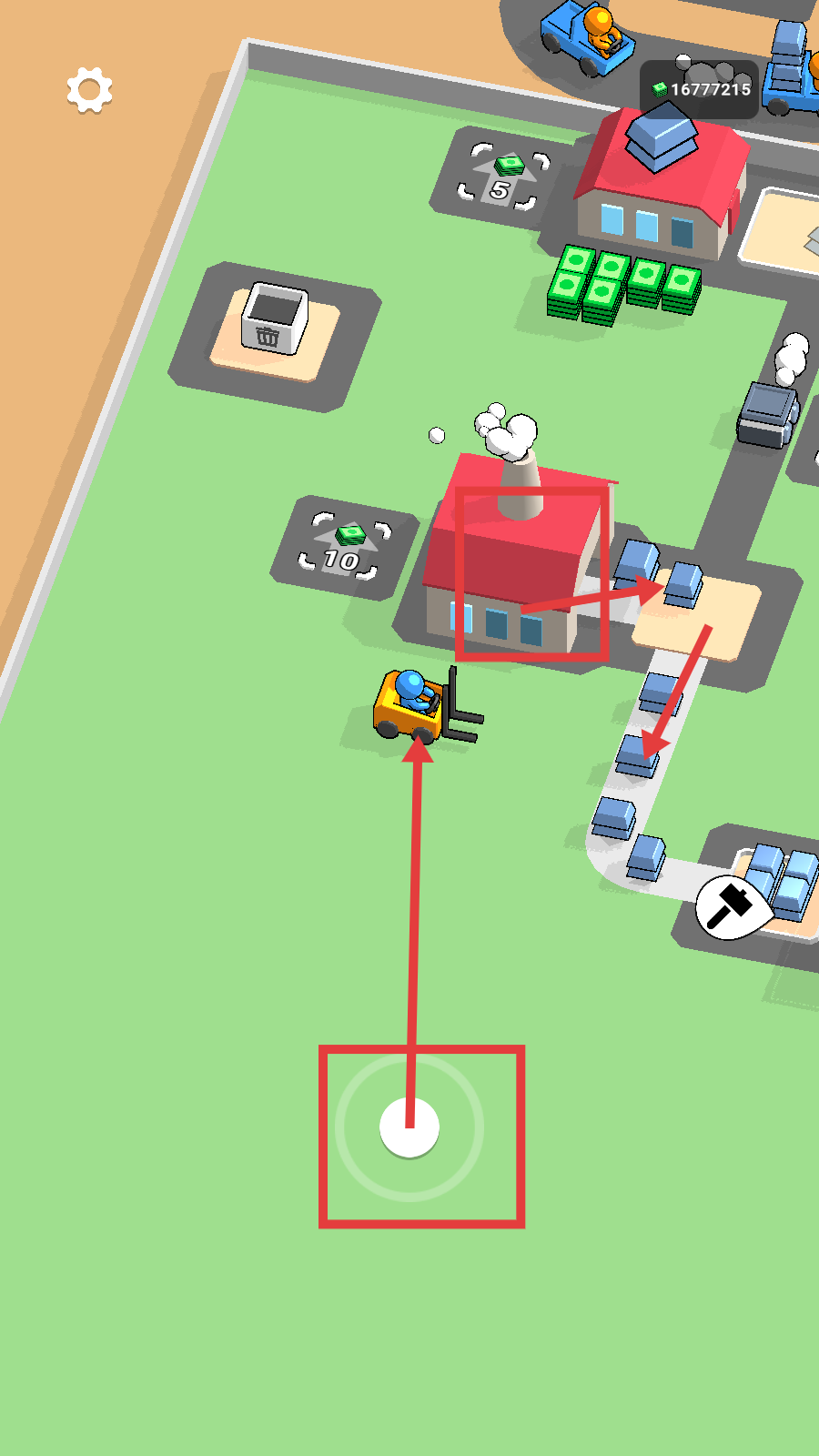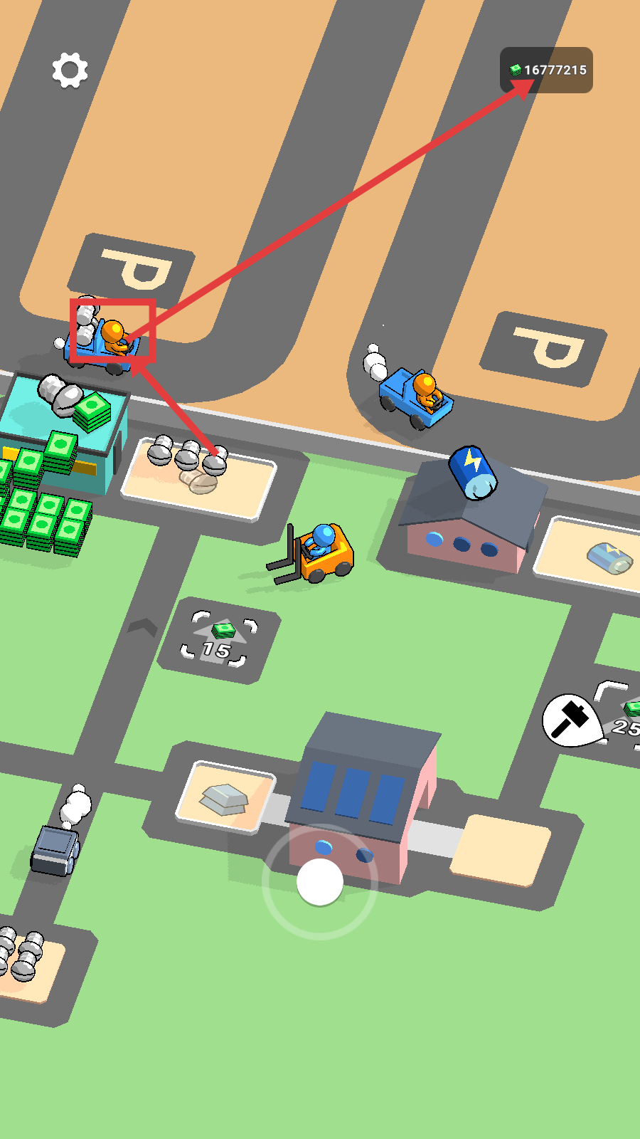 4、橙色小人驾驶车辆运输加工品,积累大量金币【16777215】,持续拓展产业,扩大生产规模。