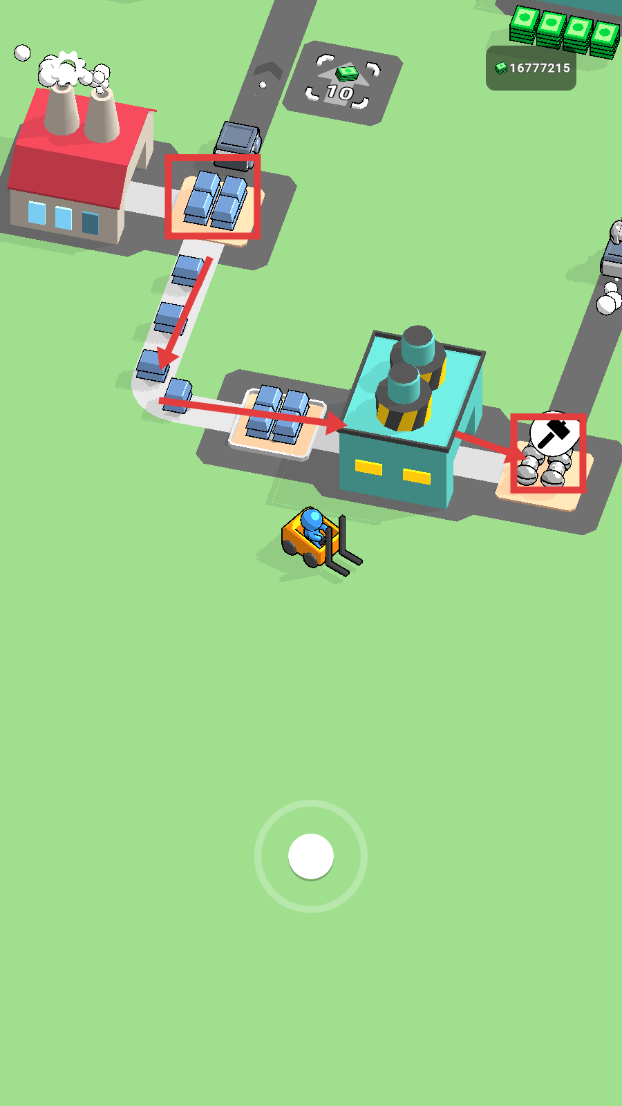 1、操作叉车从红色工厂运输蓝色货物,利用【10】资源点积累收益,开启生产运输流程。