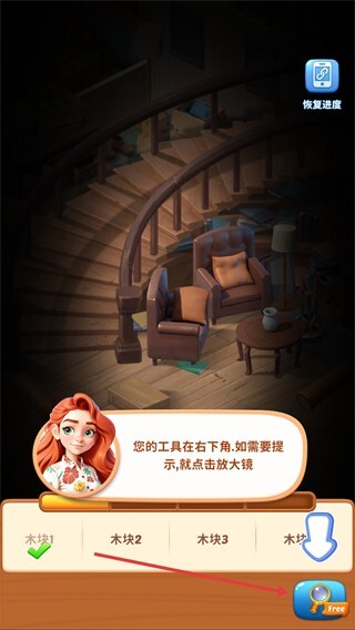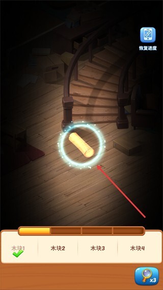 3、若遇收集困难,可点击右下角【放大镜】获取提示,辅助找到【木块】以继续推进任务。