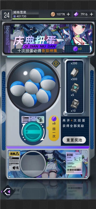 6、庆典扭蛋同样是测试福利,不得不提这里面的奖励确实很丰厚。每天完成一些简单任务就能获取扭蛋币去扭蛋,抽得差不多时还能重置奖励池。香取身集这个角色挺不错的,后续在剧场玩法中也能得到。