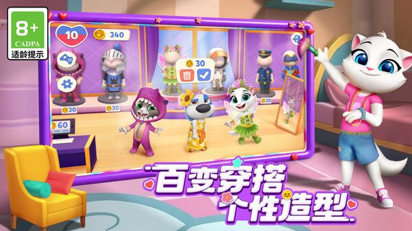 打扮他们:选择时髦的服装或可爱的配饰,和会说话的安吉拉和朋友们一起进行改造。